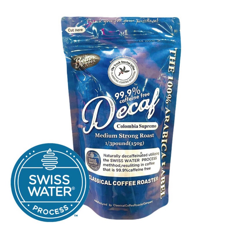 水のみでカフェインを除去するSwiss Water®プロセスでカフェイン除去したアラビカ品種コロンビアスプレモコーヒー豆。