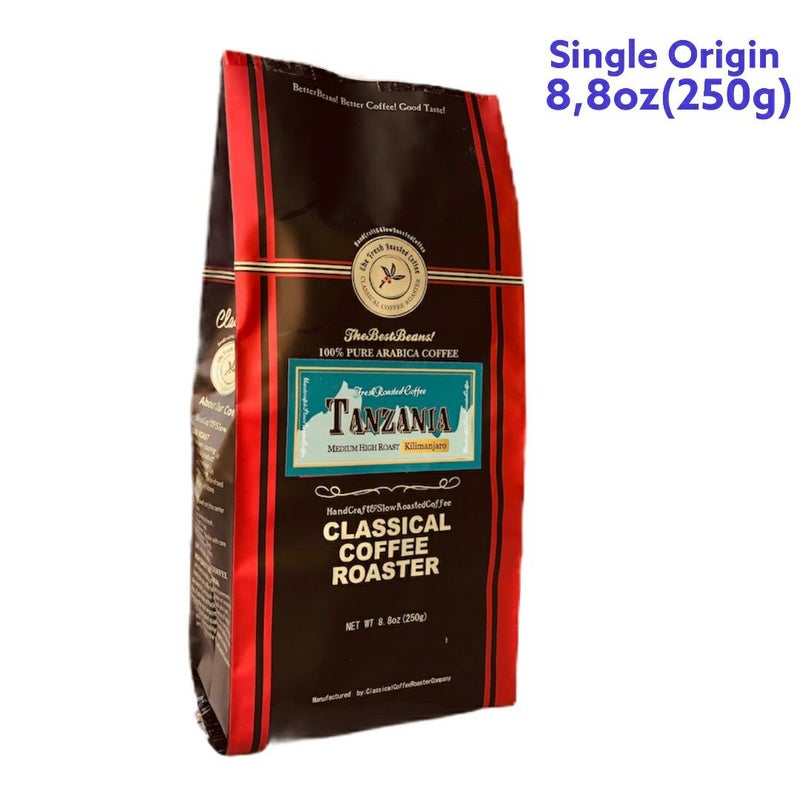 タンザニアのキリマンジャロ山、標高1,500mから2,500m付近のプランテーションで栽培された上質なタンザニアAAグレードコーヒー豆(キリマンジャロ)をストロング(深煎り)に近い(ミディアムストロング)でスローロースト。香ばしい仕上がりです。