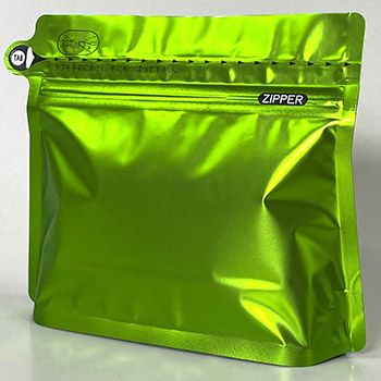 つやなし ライム色のコーヒー袋です。当社のOUTLETとなります。 開封装置付チャック袋で、中味を入れると立たせる事が出来ます。 袋の密封には上部に熱圧着ヒートシーラーをご使用ください。 内容量の目安は(100g)となりますが、焙煎具合や豆や粉の状態により同じ重量でも体積がかなり違います。記載内容量はあくまでも目安となります。 原紙構成:M-OPP/VM-PET/PE/LLD ジッパー付き